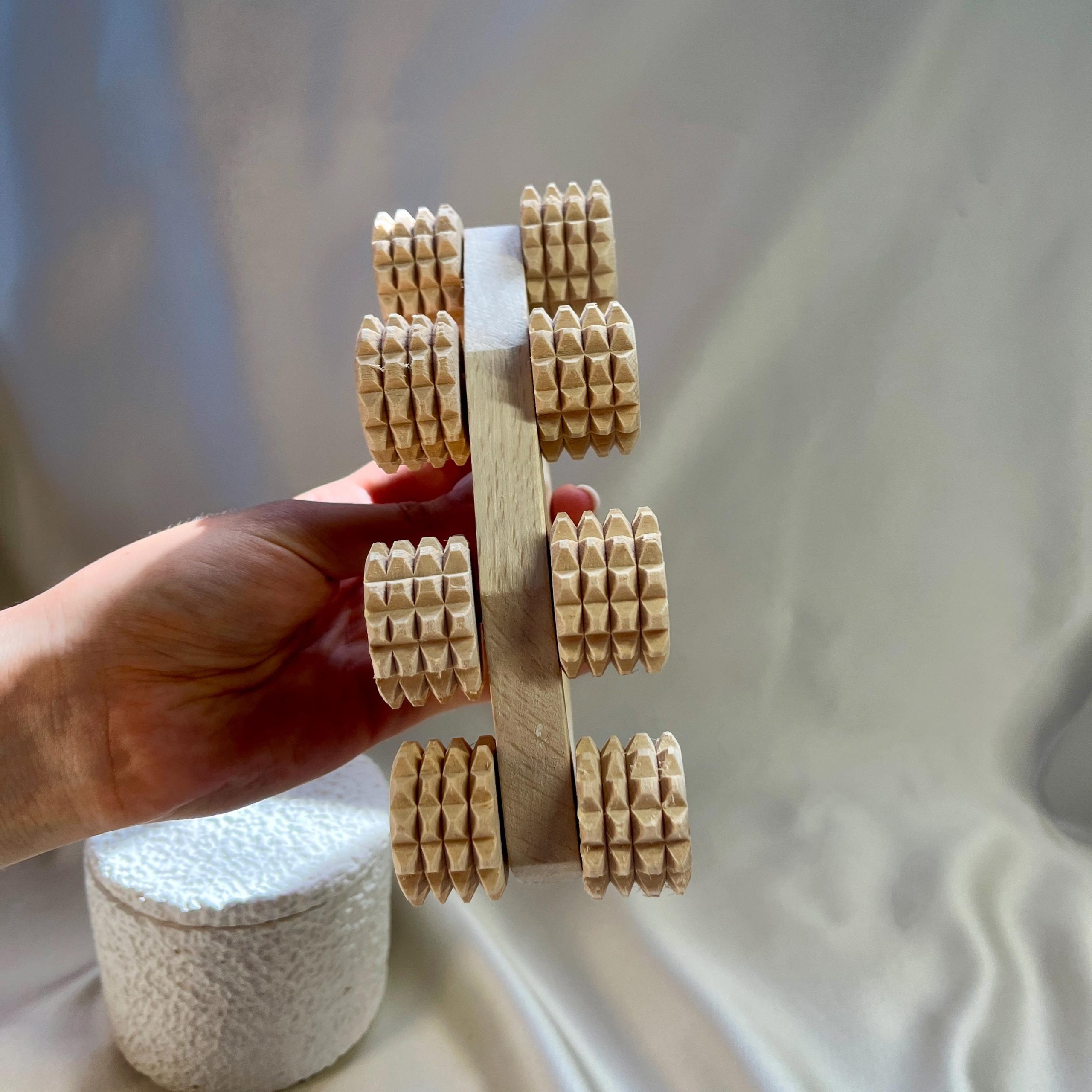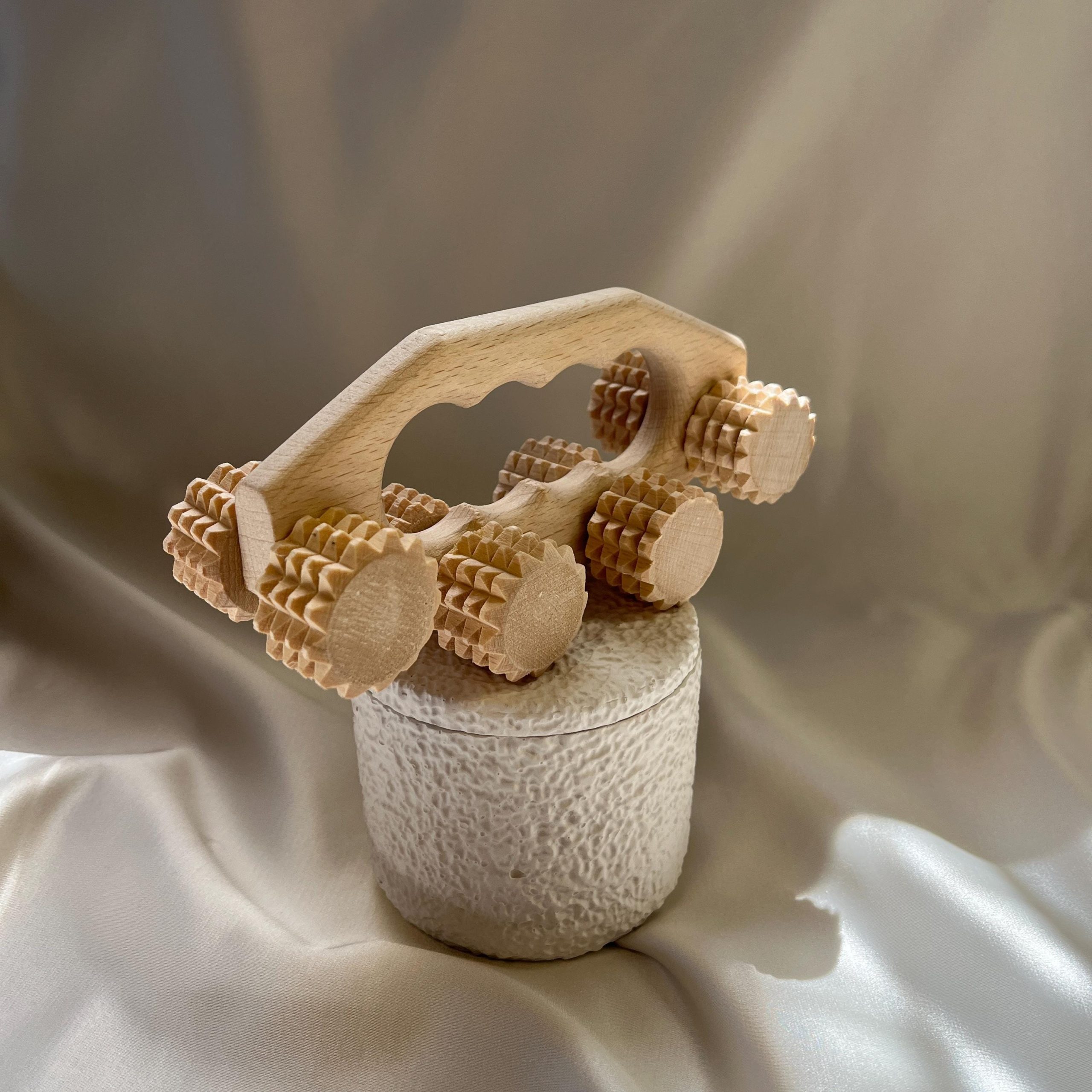 Handmade wooden massager with 8 smooth rollers. Ergonomically designed to target deep tissue, relieve muscle tension, and boost circulation. Ideal for full body relaxation on your back, legs, arms, or shoulders. Perfect for daily self-massage, post-workout recovery, or as a thoughtful gift.